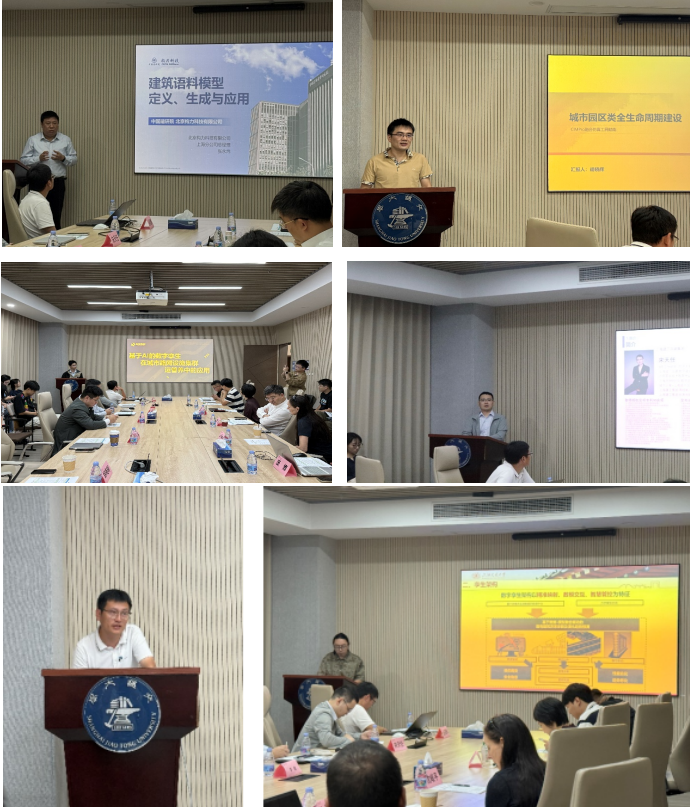 在主题报告环节,多位来自知名企业、高校与研究机构的专家分享前沿研究成果与实践案例。北京构力科技有限公司上海分公司总经理张永炜基于“量子城市”项目系统阐述“建筑语料模型”的构建逻辑与应用路径,介绍如何通过多源数据解析与AI建模,实现从图纸到语义化数字模型的自动生成,推动建筑行业实现智能化转型。擎翌智能科技有限公司智慧交通产品线技术经理张涵探讨AI与数字孪生技术在城市路网运维中的深度融合,介绍其在桥梁、隧道等重要交通设施中的集群监测、预测性维护与应急管控实践。上海建工四建集团有限公司数字建造研究中心副主任宋天任聚焦于大语言模型与建筑信息模型深度融合,展示如何通过自然语言理解与模型联动,实现设备诊断、能耗优化与安全管理的一体化运维。上海漂视网络股份有限公司产品经理胡晓辉展示CIMPro平台在多源数据融合与全生命周期管理方面的能力,分享其在上海杨浦滨江、香港IWMF等项目中的可视化仿真与决策支持实践,体现其在跨系统融合与可视化决策方面的领先能力。北京格瑞纳电子产品有限公司技术负责人丛祝辉以AnyLogic仿真平台为核心,介绍其在超大城市交通仿真与应急资源调度中的应用,涵盖地铁疏散、BRT运行评估、电力抢修等多个典型场景。3003新葡官方网站船建学院庞博从既有建筑安全运维角度出发,展示基于数字孪生的结构监测、风险诊断与寿命预测技术体系,并分享在武康大楼、瑞安大厦等示范项目中的应用成效。